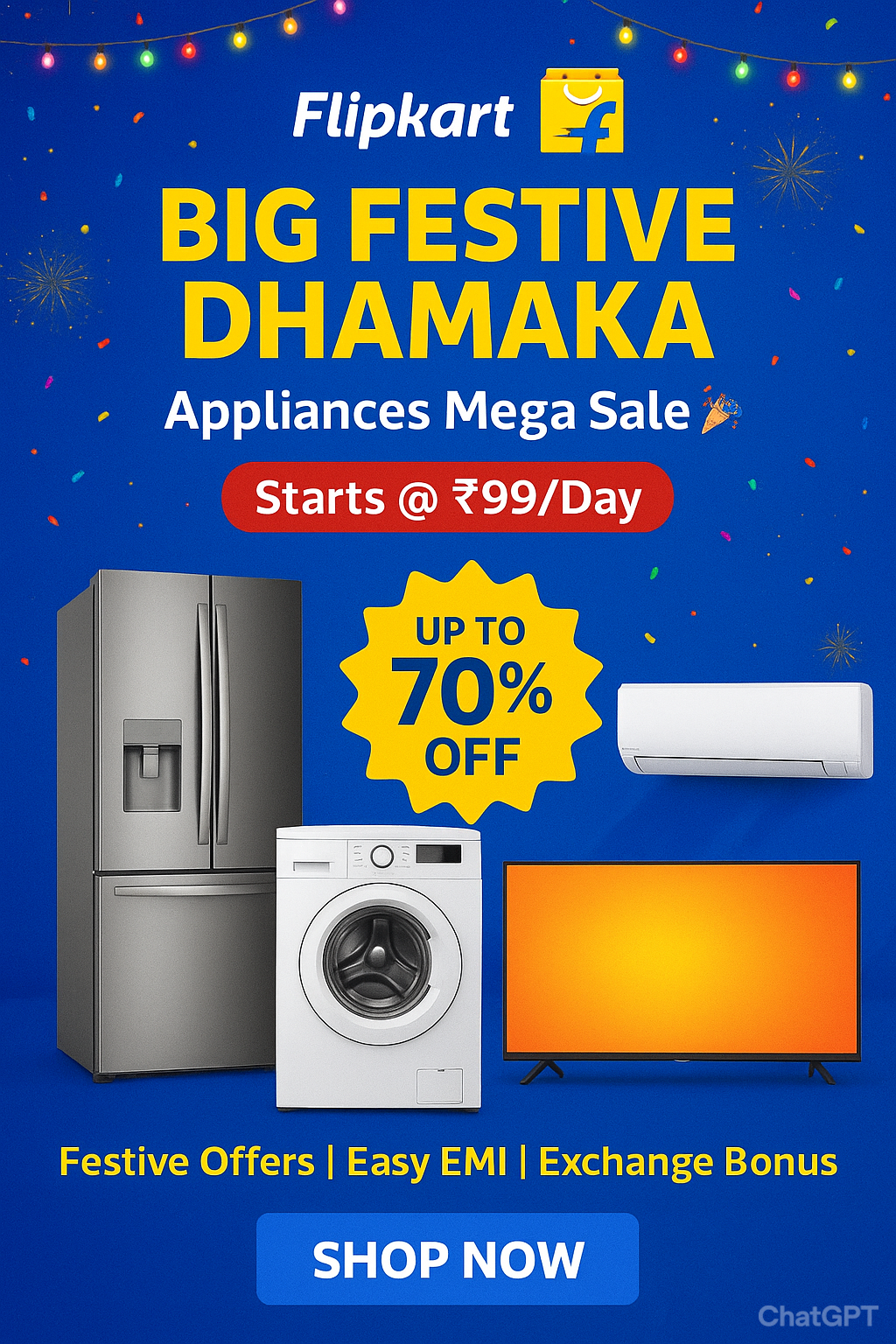 फ्लिपकार्ट की यह बिग फेस्टिव धमाका सेल त्योहारी सीजन की सबसे बड़ी सेल में से एक है। यह सेल विशेष रूप से घरेलू उपकरणों और इलेक्ट्रॉनिक्स पर केंद्रित है।