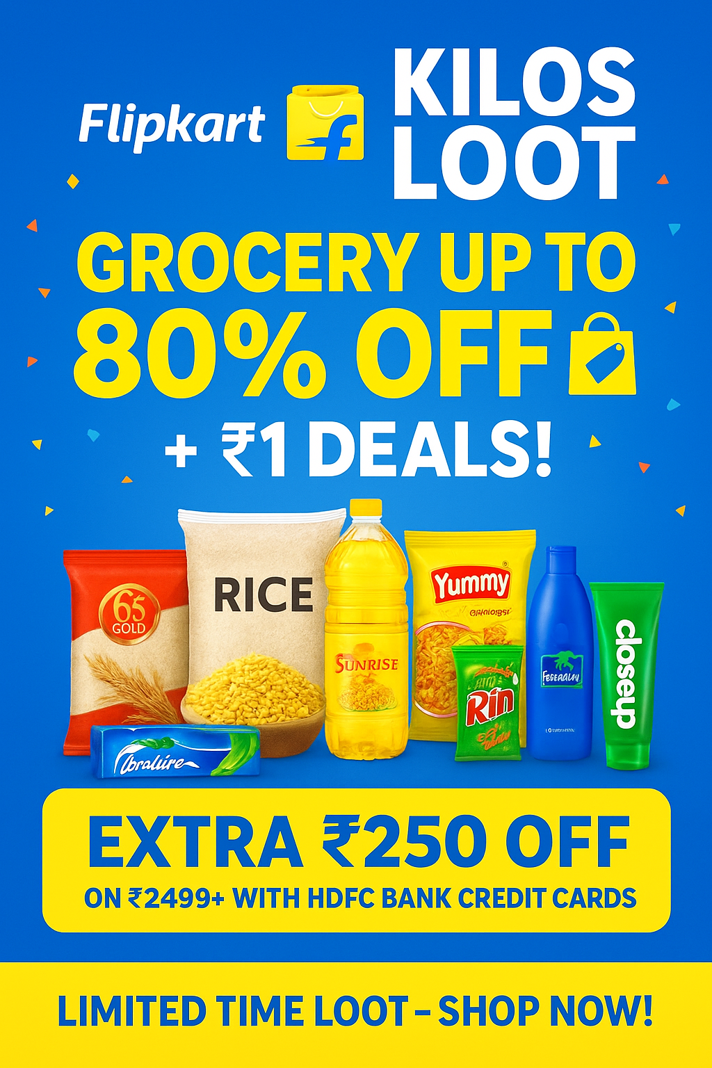 फ्लिपकार्ट किलोस लूट सेल में आपको ग्रोसरी आइटम्स पर 80% तक की शानदार छूट मिल रही है। इसके अलावा कई प्रोडक्ट्स पर सिर्फ ₹1 के डील भी उपलब्ध हैं। यह ऑफर सीमित समय के लिए है, इसलिए जल्दी करें!